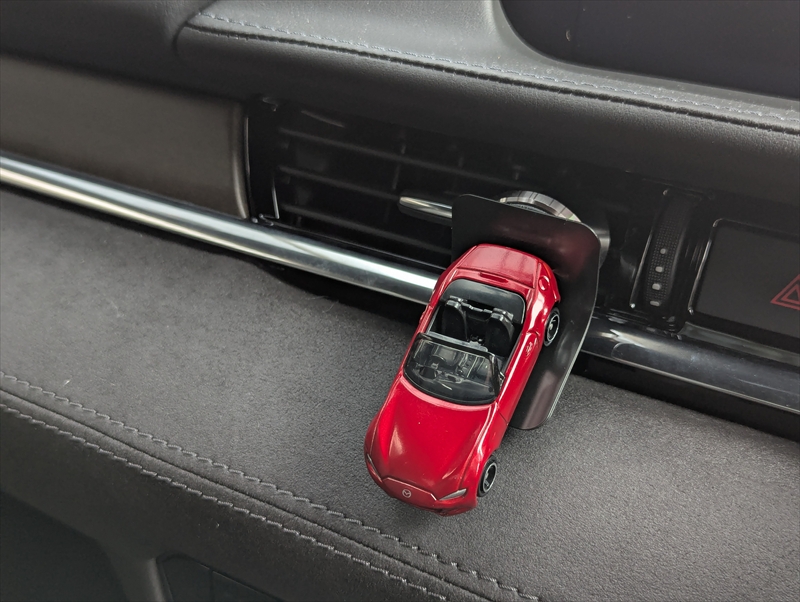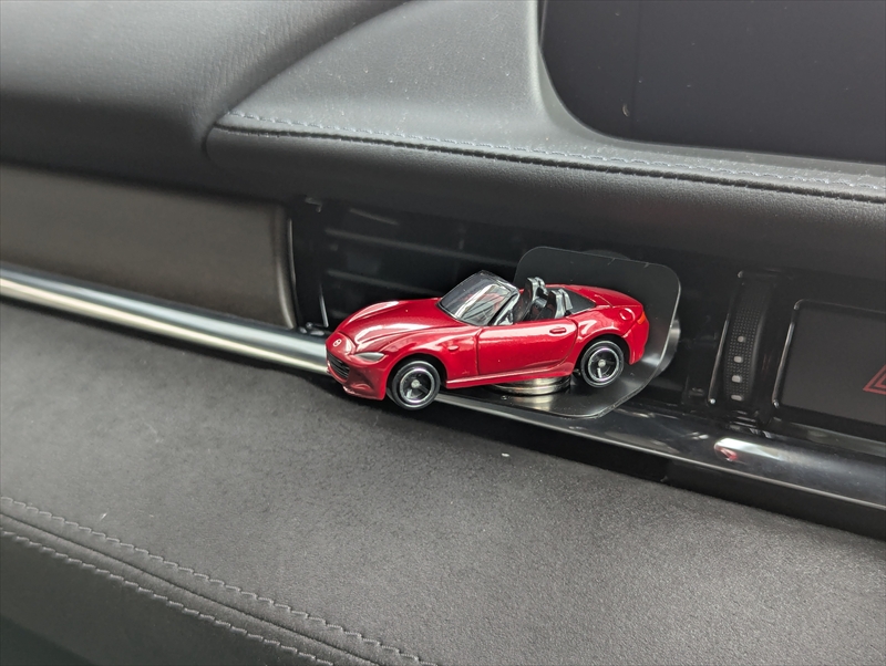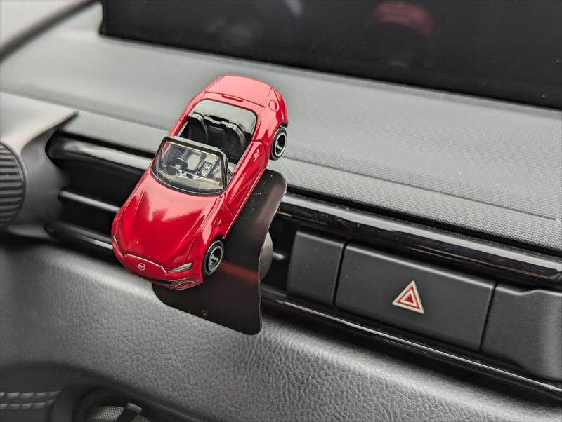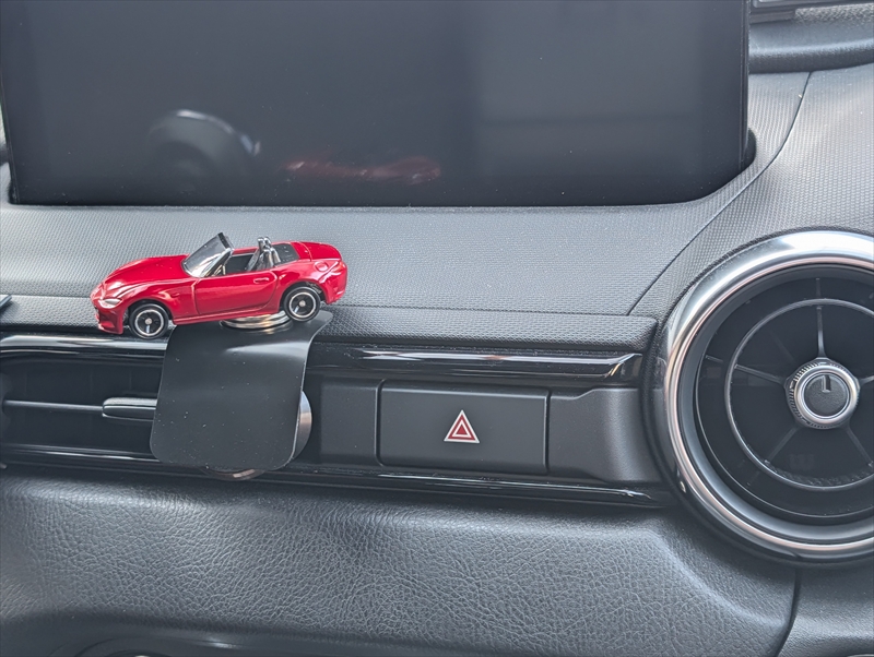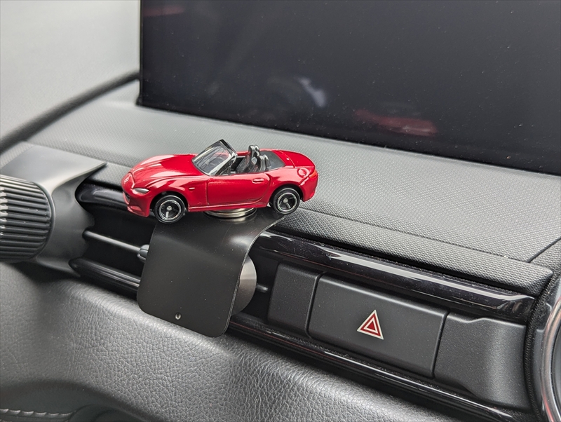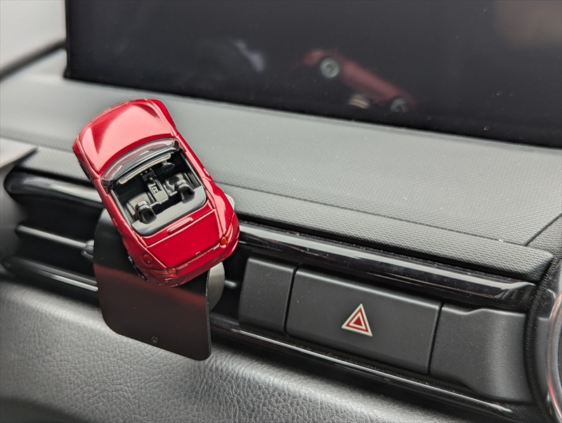 もちろん自分の手元に飾るのも愛車をいつも身近に感じられて良いのですが、クルマの中に設置してみたら思いのほかかわいい感じになりましたのでご紹介いたします。