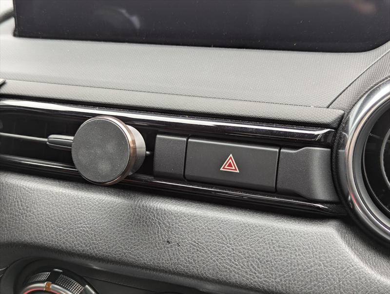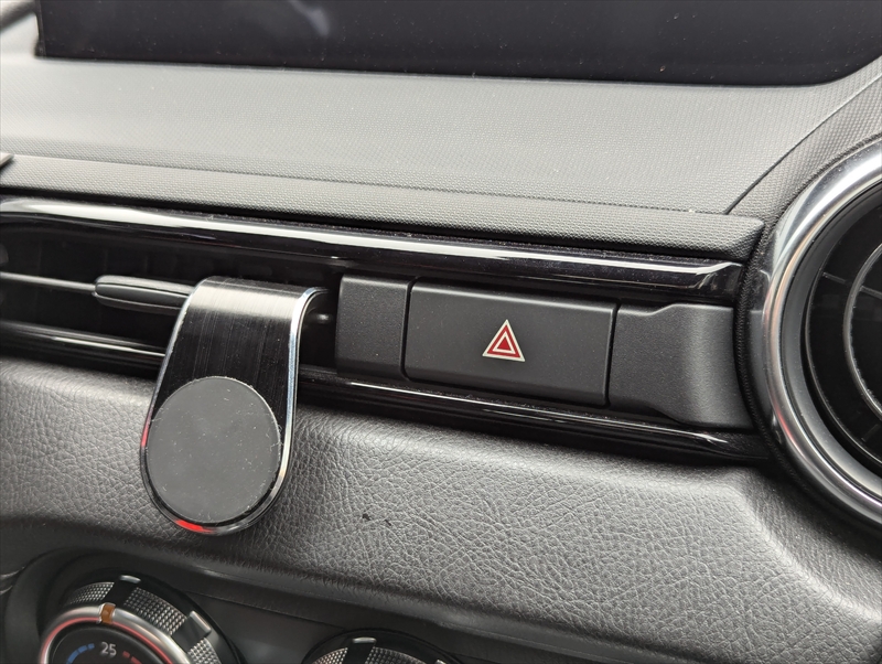 構想中は色々調べたりもしてみてダッシュボードに貼り付けるのがシンプルに思えましたが、事故の際に硬いものが飛んできて危険そうだったのでスマホホルダーを活用しエアコン吹き出し口周辺に設置しました。