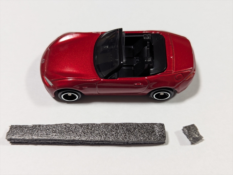 (走行時の音なり対策です。トミカだと走行中の振動で結構カチャカチャ音がするので気になると思います。黒色のスポンジだと目立ちにくくて良いです。) - ミニカーの裏側に両面テープで磁石をつける